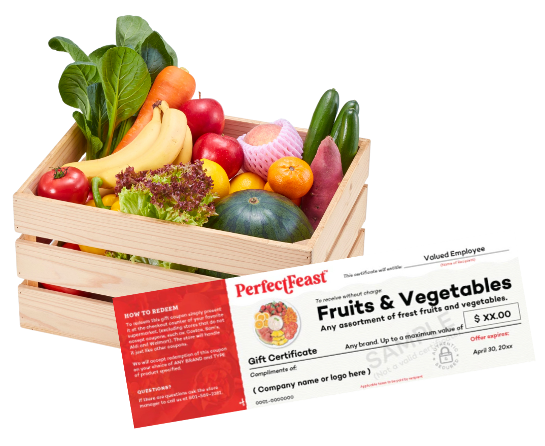 Perfect Feast Fruits and vegetables Vouchers are a tax-free (de minimis) gift, a smart choice for employers and employees. Avoid administrative, tax, and employee support issues while they enjoy a practical and personal gift.