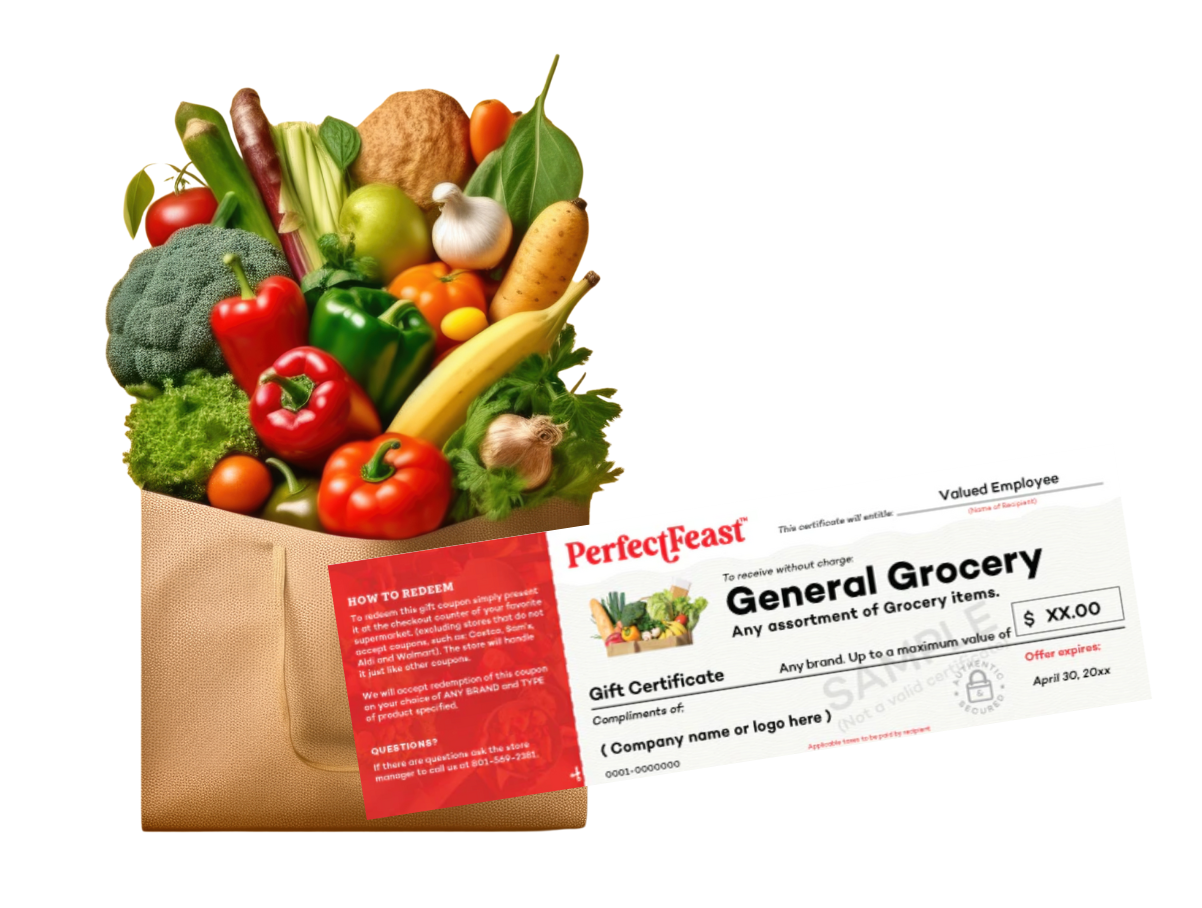 Perfect Feast General Grocery Vouchers are a tax-free (de minimis) gift, a smart choice for employers and employees. Avoid administrative, tax, and employee support issues while they enjoy a practical and personal gift.