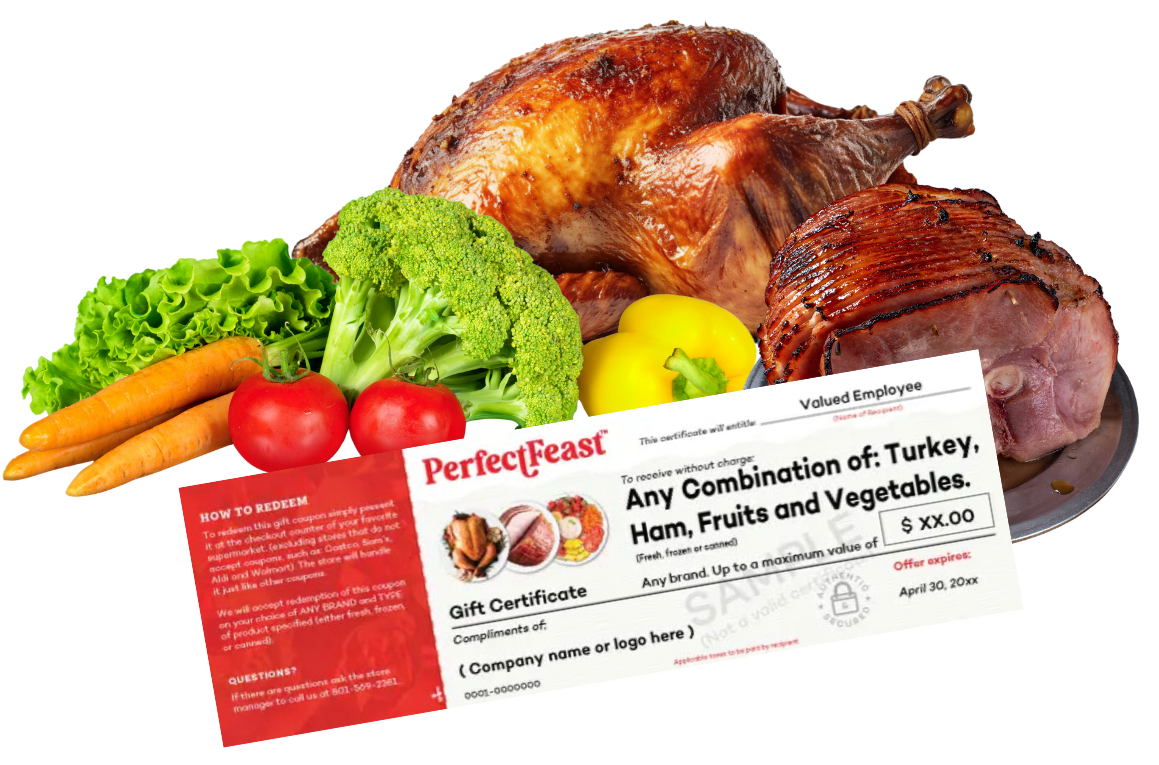 Perfect Feast Turkey, ham, fruits, and vegetable Vouchers are a tax-free (de minimis) gift, a smart choice for employers and employees. Avoid administrative, tax, and employee support issues while they enjoy a practical and personal gift.